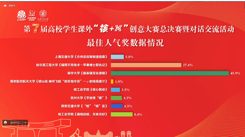 经过专家评审,第七届“核+X”创意大赛总决赛共决出一等奖2名,二等奖6名以及最佳人气奖1名。大赛对参赛单位和个人颁发优秀科普宣教员、优秀组织奖,对新增省级赛承办单位授牌。