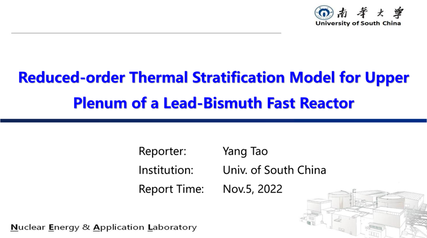 杨涛做了题为《Research on Core Power Maximization Method of Natural Circulation Lead-bismuth Cooled Fast Reactor》的学术报告。报告针对反应堆热分层现象的模拟研究,为克服传统热分层分析方法的缺陷,基于CFD技术得到高精度的全阶热分层模型,通过特征正交基分解(Proper Orthogonal Decomposition,POD)与Galerkin投影结合的方法构建降阶模型。通过与CFD的全阶模型对热分层现象的对比分析,研究发现所开发的降阶热分层模型能很好地模拟上腔室温度分布,能快速的进行铅铋快堆事故下的热分层界面特性研究,此对研究热分层现象产生机理,有效遏制热分层现象产生提供重要的分析工具。