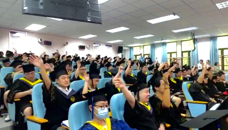 仪式开始前,2019级本科毕业生杨宏翼、甘雨静两位同学献唱暖场歌曲:《凤凰花开的路口》《同桌的你》,师生集体合唱,略带伤感的歌声里,承载着同学们对离别的不舍和眷恋,挥动的手臂,定格了青春最美的模样。