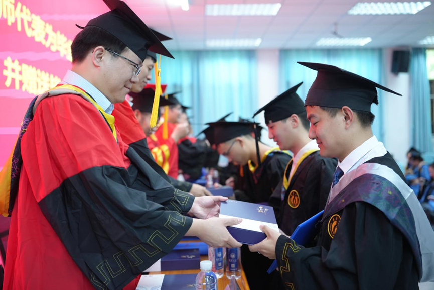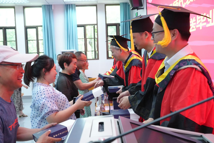 随后举行了学位授予仪式,全体毕业生代表依次上台,导师们为毕业生代表们拨穗、颁发学位并赠送毕业礼物。还有来自全国各地的20余名家长代表也到了仪式现场,一起见证同学们的毕业和成长。导师们也为家长们赠送了礼物。