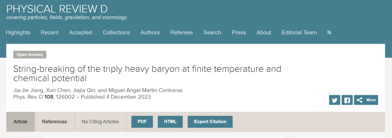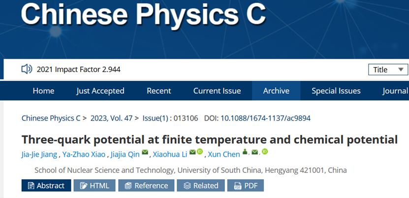 近日,公司核物理专业2001班本科生江佳杰以第一作者身份,在国际物理学权威期刊、Top期刊《Physical Review D》(Phys. Rev. D 108 (2023) 126002,IF=5)发表了题为《String-breaking of the triply heavy baryon at finite temperature and chemical potential》的SCI一区论文。该文章是江佳杰同学在陈勋老师、秦佳佳老师和Miguel Angel Martin Contreras老师指导下完成。这也是该同学的第二篇高质量科研论文,也就是去年的同一时间,江佳杰同学以第一作者身份已经在中国科技期刊卓越行动计划重点期刊《Chinese Physics C》(Chinese Physics C Vol. 47, No. 1 (2023) 013106,IF=3.6)发表题为《Three-quark potential at finite temperature and chemical potential》的SCI论文。该文章是江佳杰同学与肖亚朝同学在陈勋老师、秦佳佳老师和李小华教授指导下完成的。除了在学术研究方面的表现,江佳杰同学还获得了老员工创新创业训练项目省级项目立项1项。这两篇文章均得到了国家自然科学基金、湖南省自然科学基金和教育厅项目的支持。