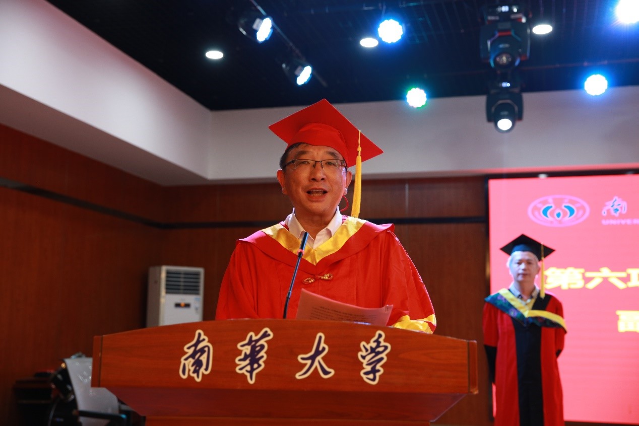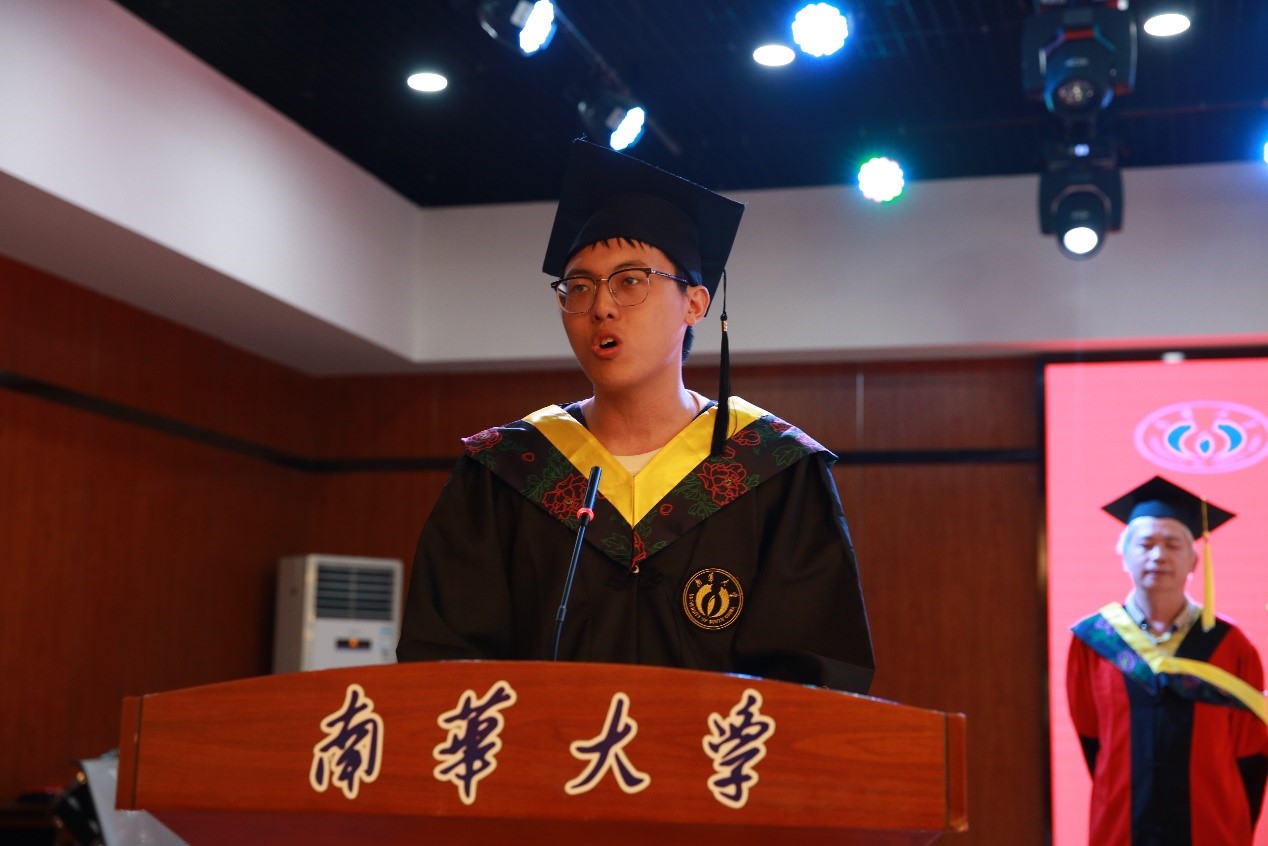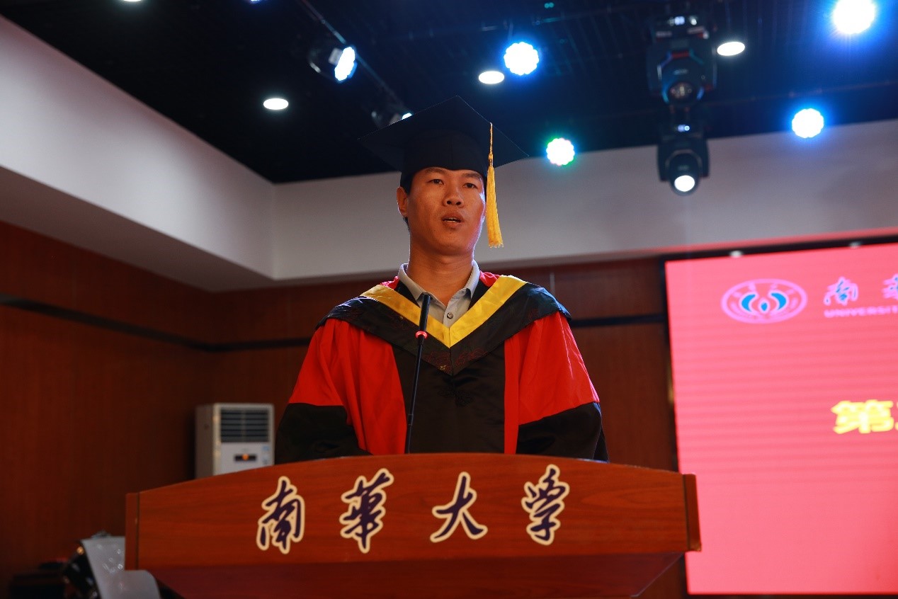 硕士毕业生代表刘程伟同学发言,他在一点一滴、一处一景中回顾了求学南华的难忘时光,并依次表达了对导师、公司、同窗们的感谢与不舍,他表示,在今后的人生道路上会继承和弘扬“热爱祖国、无私奉献,自力更生、艰苦奋斗,大力协同、勇于登攀”的两弹一星精神,会牢记恩师们的教诲、鞭策自己、脚踏实地在新的岗位上做一个知荣辱的人。