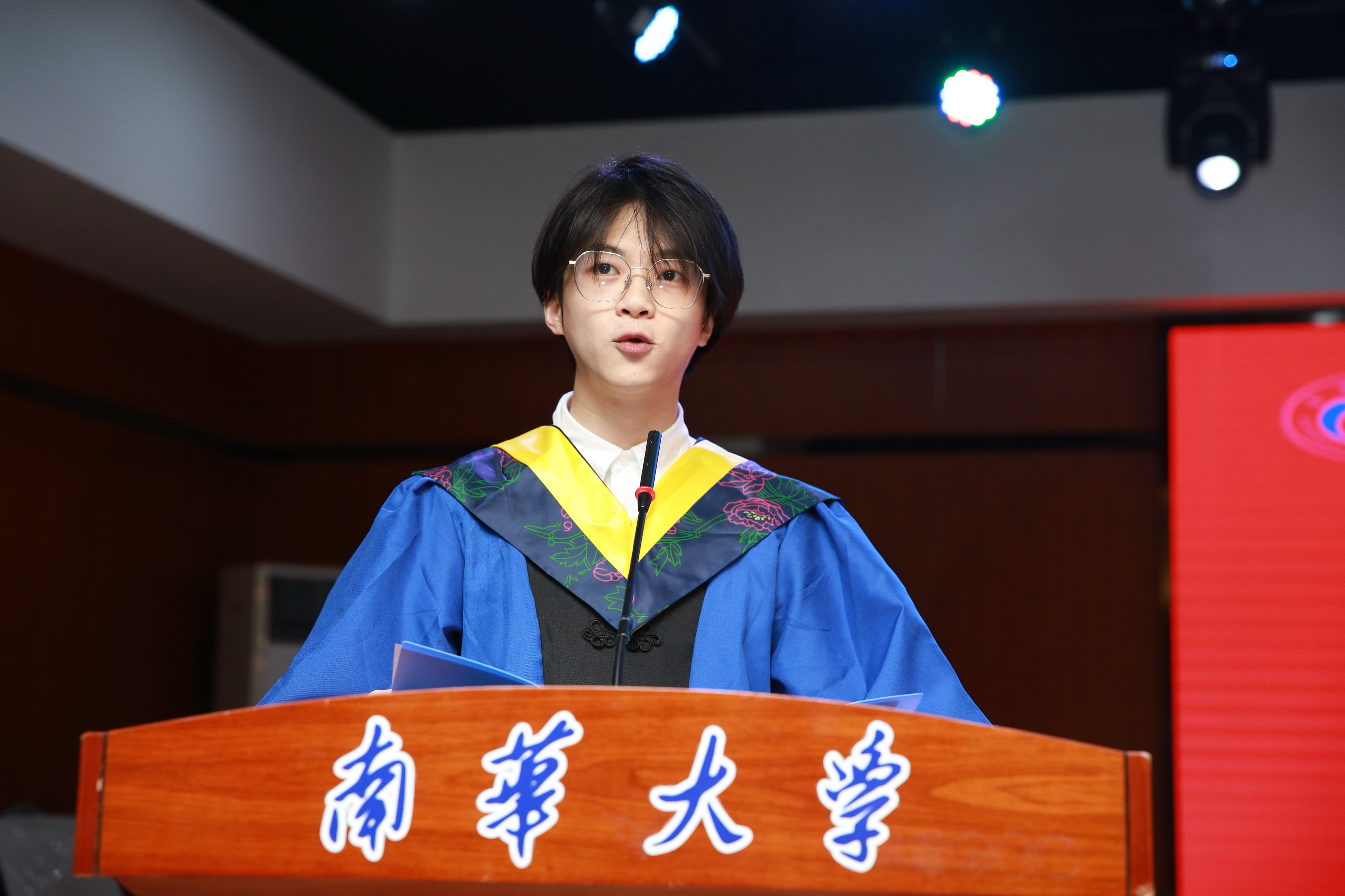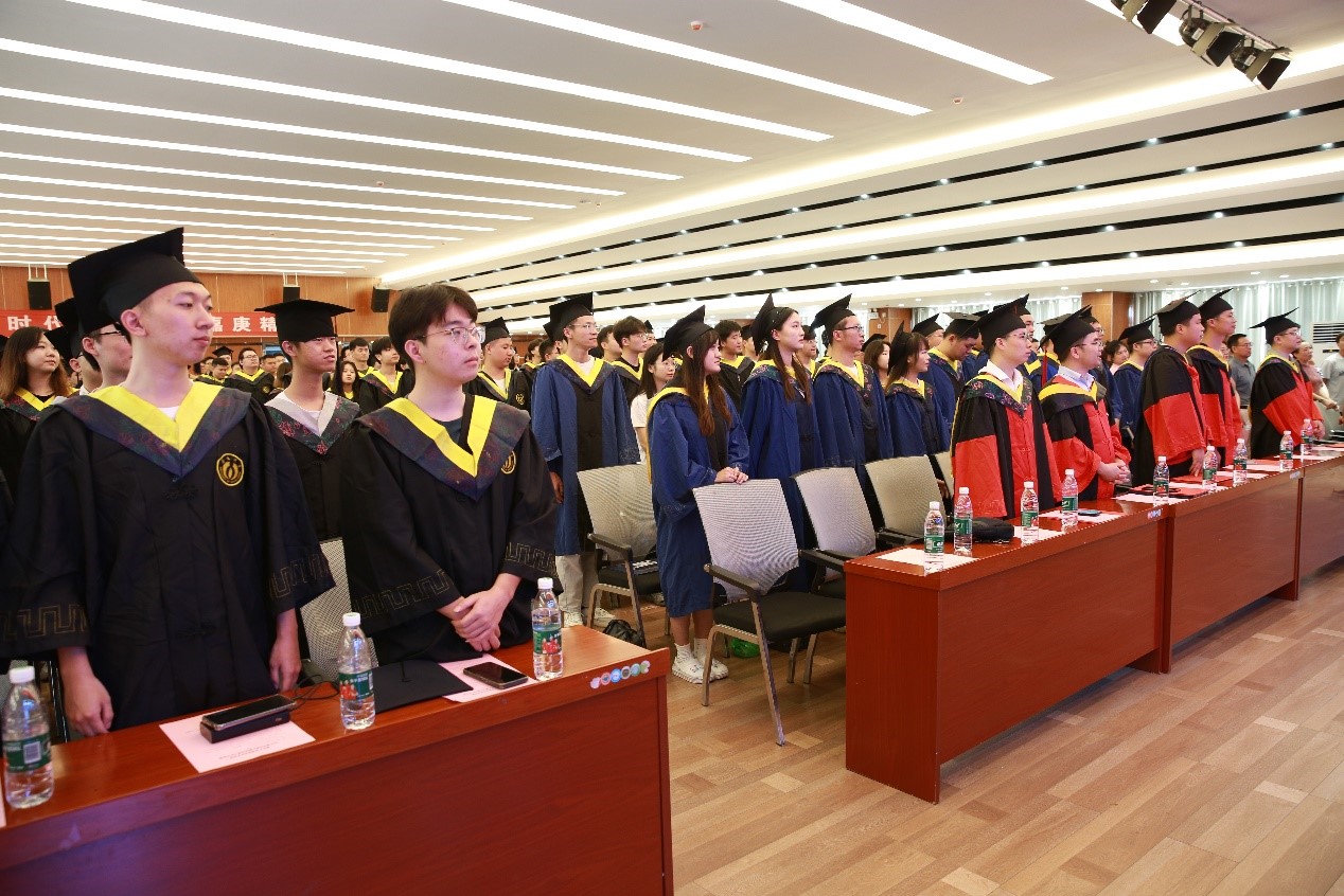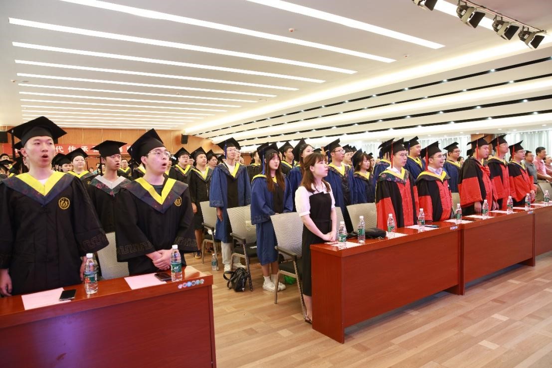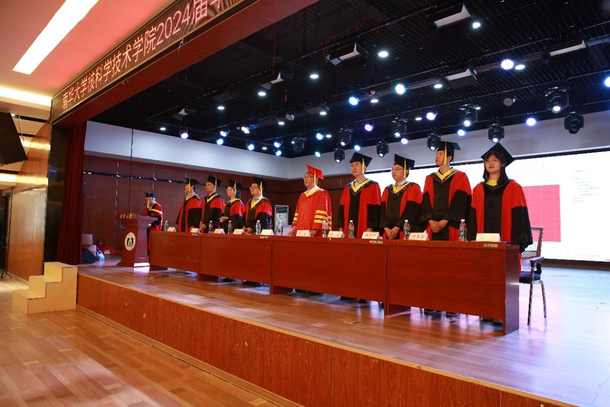 硕士毕业生代表刘程伟同学发言,他在一点一滴、一处一景中回顾了求学南华的难忘时光,并依次表达了对导师、公司、同窗们的感谢与不舍,他表示,在今后的人生道路上会继承和弘扬“热爱祖国、无私奉献,自力更生、艰苦奋斗,大力协同、勇于登攀”的两弹一星精神,会牢记恩师们的教诲、鞭策自己、脚踏实地在新的岗位上做一个知荣辱的人。