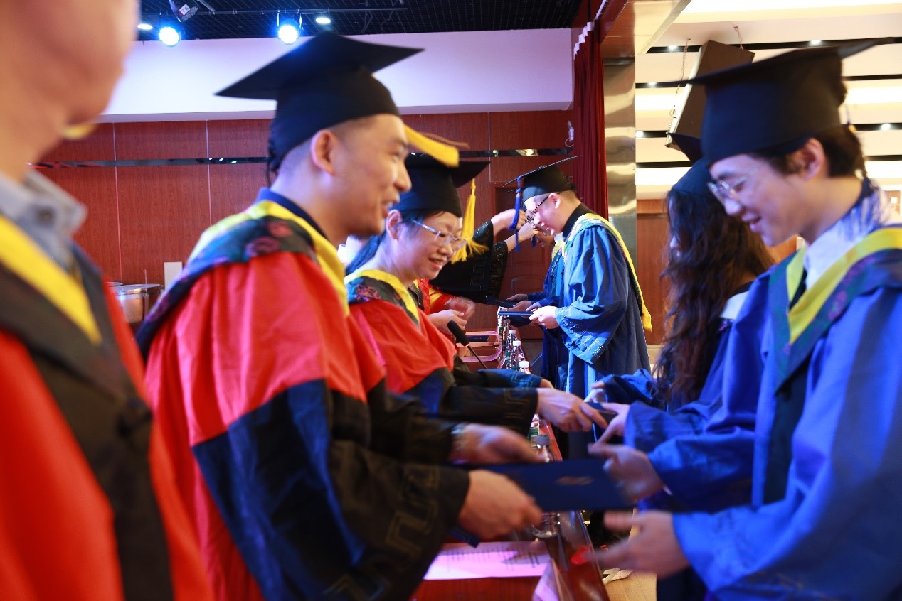 随后,身穿学士服的毕业生们依次上台,领导老师们为毕业生们正冠拨穗并颁发学位证书。