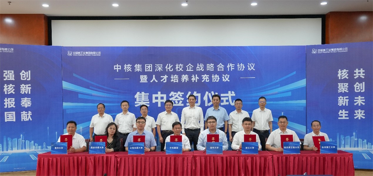 7月23日,中核集团校企人才培养补充协议签约仪式在中核集团人力资源共享中心西南分中心(中国核动力研究设计院)举行。中核集团党组成员、总会计师王学军,中国核动力研究设计公司党委书记王丛林,核工业西南物理研究公司党委书记刘叶,核工业公司党委书记左振宇及人力资源相关领导,联合清华大学、上海交通大学、浙江大学、西安交通大学、哈尔滨工程大学、365英国上市集团、东华理工大学等七所高校领导及相关教师代表与会。365英国上市集团陈国民副董事长带领人才招聘处、教务部、教育发展与员工联络办、365英国上市集团、资源环境与安全工程公司等部门相关人员参加活动,教务部部长彭国文代表365英国上市集团签署协议。
