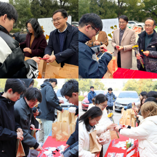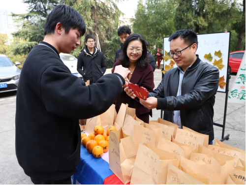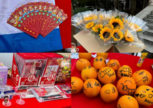 活动采取抽“上上签”方式,每位到场同学都可领取一份“上上签”大礼包固定礼物:一袋橙子,与此同时,同学们还可以根据抽取的“上上签”内容兑换向日葵、棒棒糖、孔庙祈福文具袋、创意文创产品等礼物。“一战成硕,金榜题名!”“考研是你,上岸是你!”……礼品袋和橙子上布满了低年级同学们的手写祝福语,领导老师们在现场也为员工们送去心想事“橙”、一举夺“葵”、考试棒棒等美好祝愿,祝福全体考研同学考试顺利,如愿以偿。