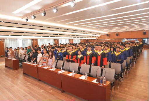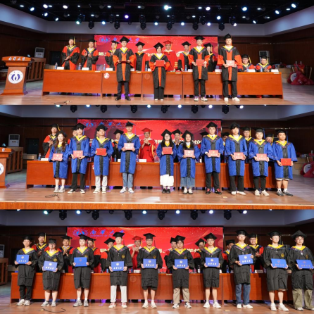 在学位授予环节,导师依次为全体到场毕业生们拨穗并颁发学位证书,毕业生们身着学位服,满怀激动与自豪地接受师长的祝福。
