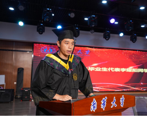 毕业生代表发言环节中,研究生毕业生代表张海峰和本科毕业生代表李耀阳分别发言,两位同学表达了对母校、师长的感激之情,并分享了在校期间的难忘经历,承诺将以实际行动回报母校和社会。