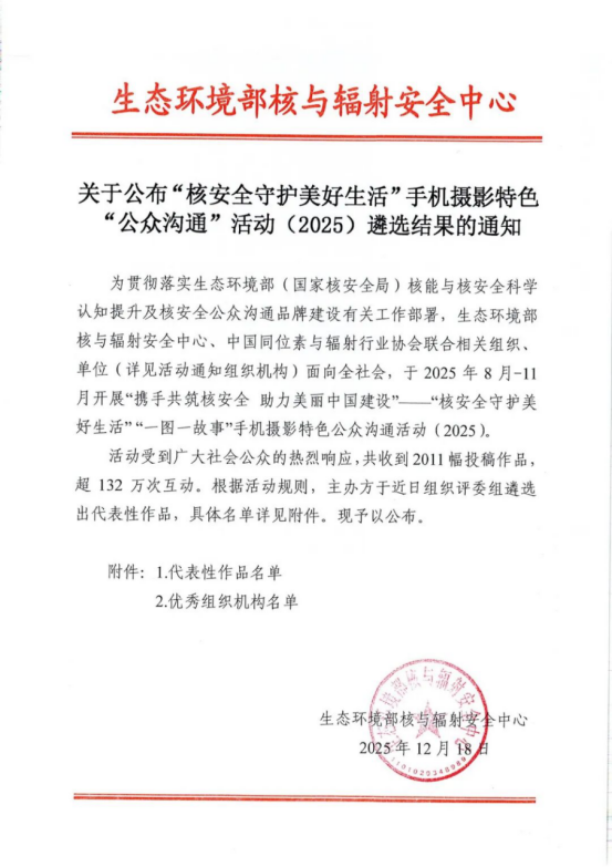 近日,由生态环境部核与辐射安全中心、中国同位素与辐射行业协会联动相关组织、单位组织开展的“携手共筑核安全 助力美丽中国建设”——“核安全守护美好生活” 圆满落幕,365英国上市集团在本次活动中获评“优秀组织机构”。