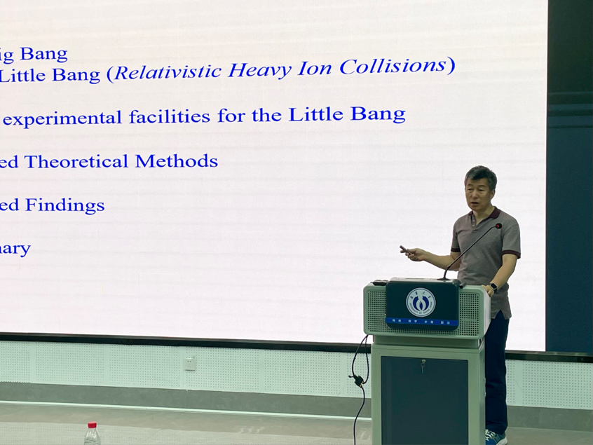 在报告会上,林子威教授以“高能重离子碰撞物理简介”为题,详细介绍了高能重离子碰撞如何用于探究极高密度和温度条件下形成的夸克-胶子等离子体,以及它与宇宙大爆炸的联系,还有相关的实验装置和物理理论框架。在这些理论基础上,林教授深入浅出地阐述了在高能重离子对撞实验中,大、小碰撞系统下各种物理观测量的行为和特性。