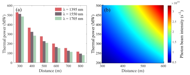图2.假定GF流强为1019photons/s时,ANES的热功率随GF-ANES之间的距离的变化(a);所需的GF流强随热功率和距离的依赖关系(b)。