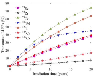 图3.GF-ANES运行20年后的LLFPs嬗变效果。7种典型LLFPs的嬗变百分比是99Tc ≈129I >107Pd >79Se ≈137Cs >135Cs >93Zr。
