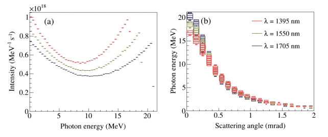 图1.激光脉冲与40Ca18+离子束对撞产生的伽马束流强度分布(a)和能量-散射角依赖关系(b)。模拟计算时,激光脉冲能量5 mJ,40Ca18+离子束的能量91 TeV,激光和离子束的对撞角度179o,重复频率为20 MHz。