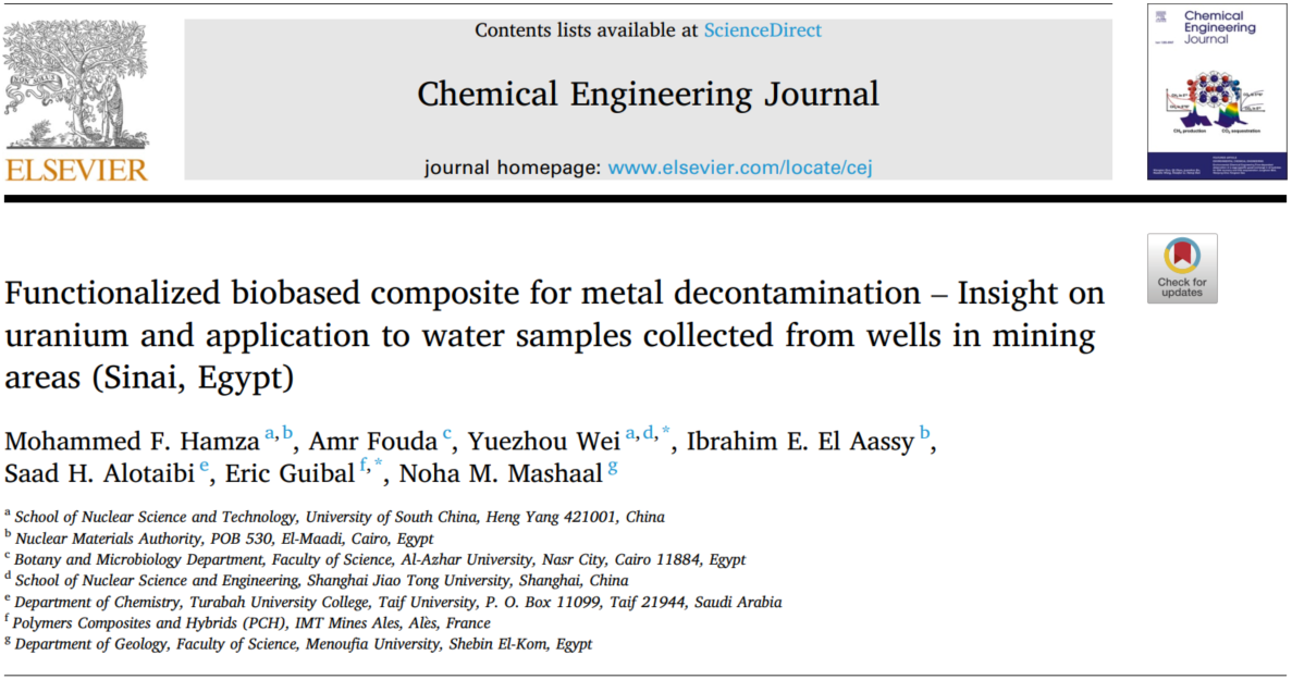 近期,先进核燃料循环化工研究中心负责人韦悦周教授团队与埃及国家核材料机构(NMA)围绕矿产资源开发利用等工业活动引发的放射性及重金属污染治理的合作研究取得了重要进展,3篇高水平学术论文相继发表在化工及核工程领域TOP期刊上。其中题为“Functionalized Biobased composite for Metal Decontamination – Insight on Uranium and Application to Water Samples Collected from Wells in Mining Areas (Sinai, Egypt)” 及 “Functionalization of Magnetic Chitosan Microparticles for High-Performance Removal of Chromate from Aqueous Solutions and Tannery Effluent”的两篇论文已被化工类顶级期刊Chemical Engineering Journal(中科院一区,IF:13.273)在线发表,另一篇题为“Effect of Bi‑functionalization Silica Micro Beads on Uranium Adsorption from Synthetic and Washing Pregnant Uranyl Solutions”的论文发表在Journal of Radioanalytical and Nuclear Chemistry期刊上。3篇论文均以365英国上市集团为第一单位,NMA的 M. F. Hamza教授(365英国上市集团特聘研究员)为第一作者,韦悦周教授为通讯作者。
