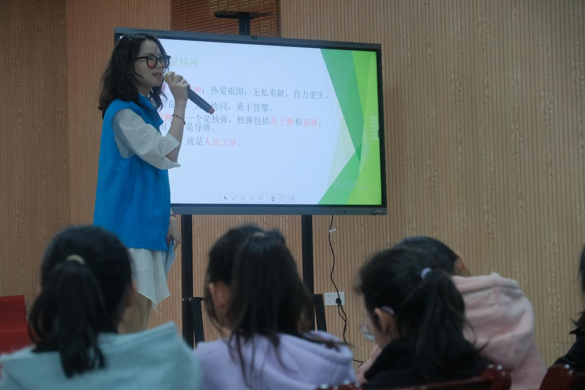 活动现场,服务团志愿者来自核物理201班的蔡雨漫同学以生动有趣的方式,向师生们介绍了“两弹一星”精神的历史背景和时代价值,核工业的发展历程和前沿动态,以及核科学的基本原理和应用领域。在互动环节,志愿者们还设计了互动问答和小游戏,激发了员工们的好奇心和求知欲。
