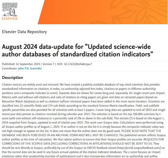 据悉,全球前 2% 顶尖科学家榜单,是美国斯坦福大学 John P. A. Ioannidis 教授团队与 Elsevier 合作,发布在 Elsevier 旗下的 Mendeley Data 网站。榜单采用论文总引用量、个人 h 因子、共同作者修正 Hm 因子、单独、第一或者最后作者文章引用量等 6 种综合指标,分为 22 个领域和 176 个子领域,根据“生涯影响力”(关注整个学术生涯迄今影响力)和“年度影响力”(聚焦本年度学术成绩),从近 700 万名科学家中遴选出世界排名前 2% 的科学家,综合反映其科研状态和长期影响力。